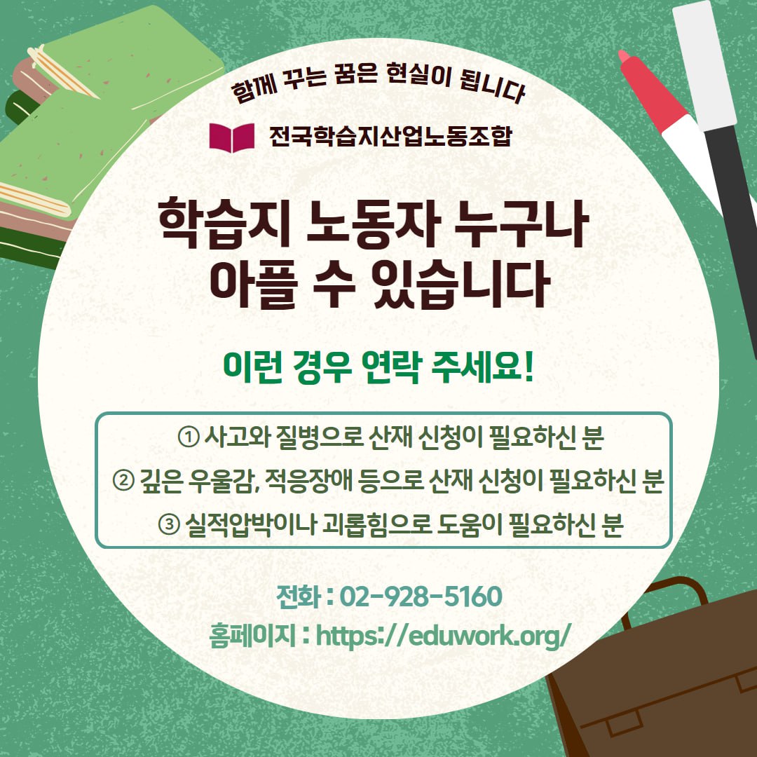학습지노동자들은 학생의 첫 선생님이자, 가정 방문으로 교육을 연결하는 중요한 노동자입니다.하지만 특수고용이라는 이유로 법의 사각지대에 놓여 있으며,누구도 이들의 통증을 ‘노동’의 결과로 인정하지 않습니다. 건강한 교사 없이 건강한 교육은 불가능합니다.이제는 우리 스스로 건강권을 지키기 위해 목소리를 낼 때입니다.노동조합은 언제나 그 싸움의 곁에 있겠습니다.
